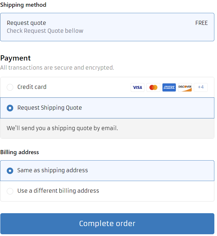 Select "Request Shipping Quote" as a payment method and we'll follow up with a shipping quote shortly after.